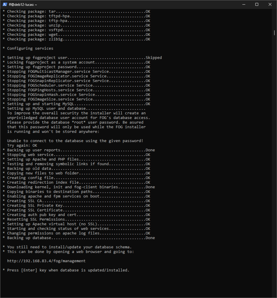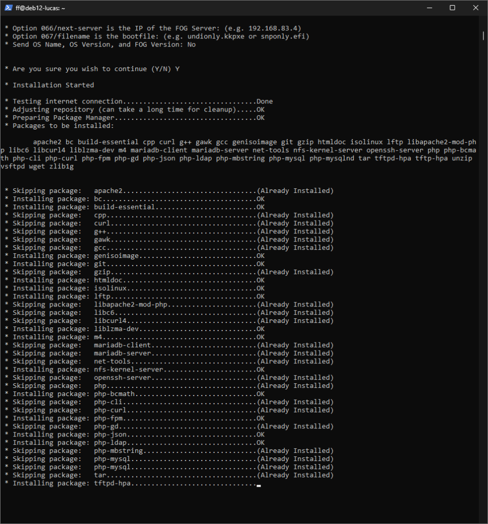 Une fois les paramètres enregistrés, FOG installera les packages manquants :