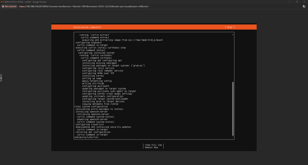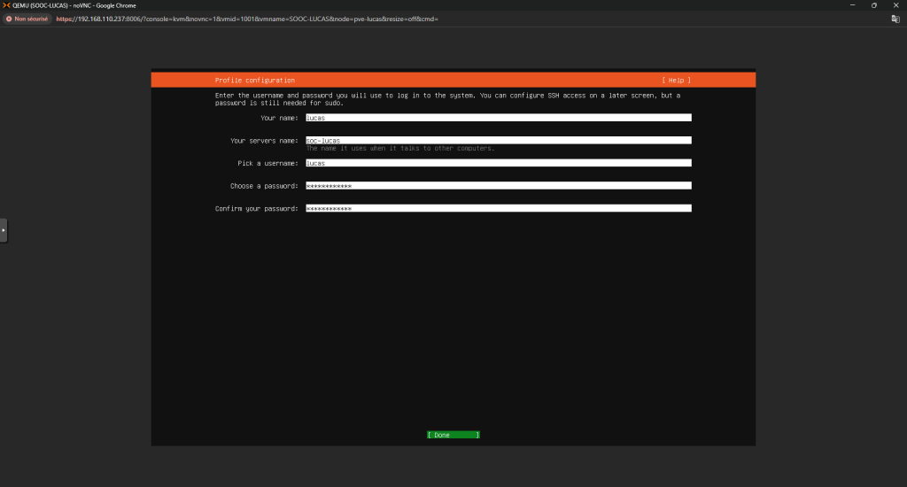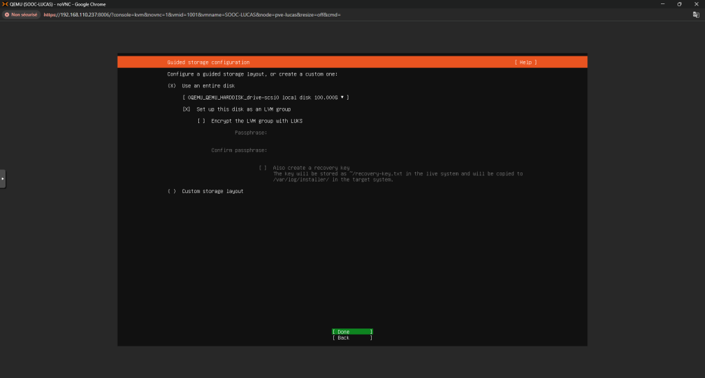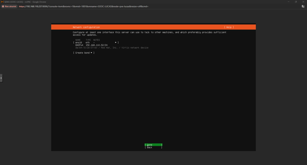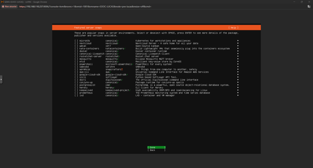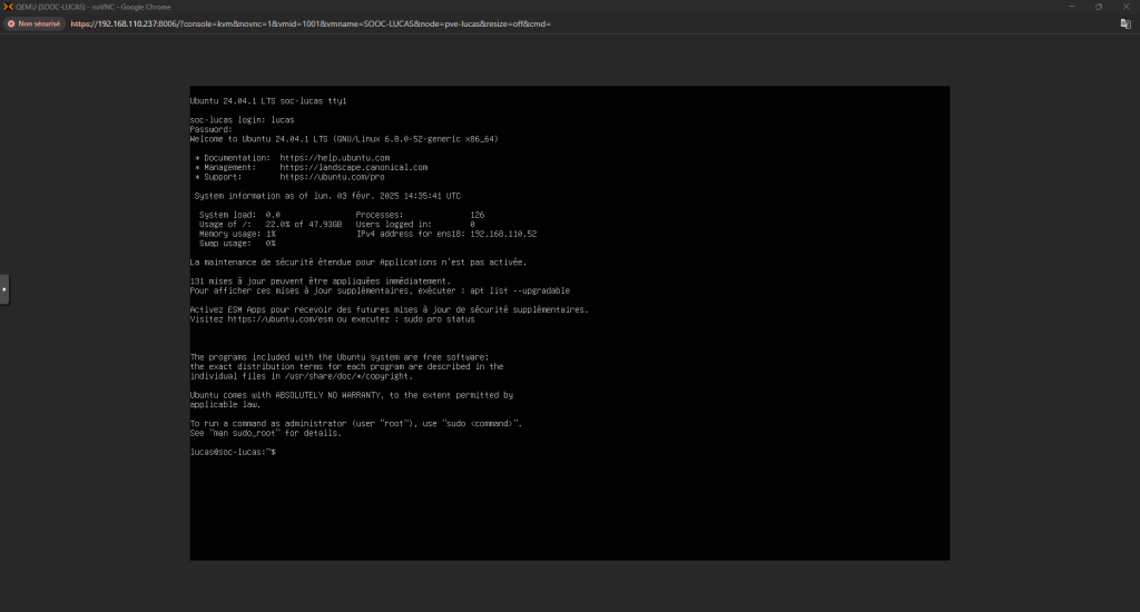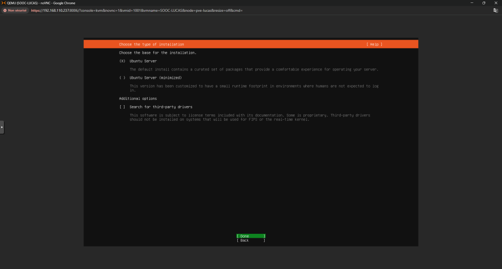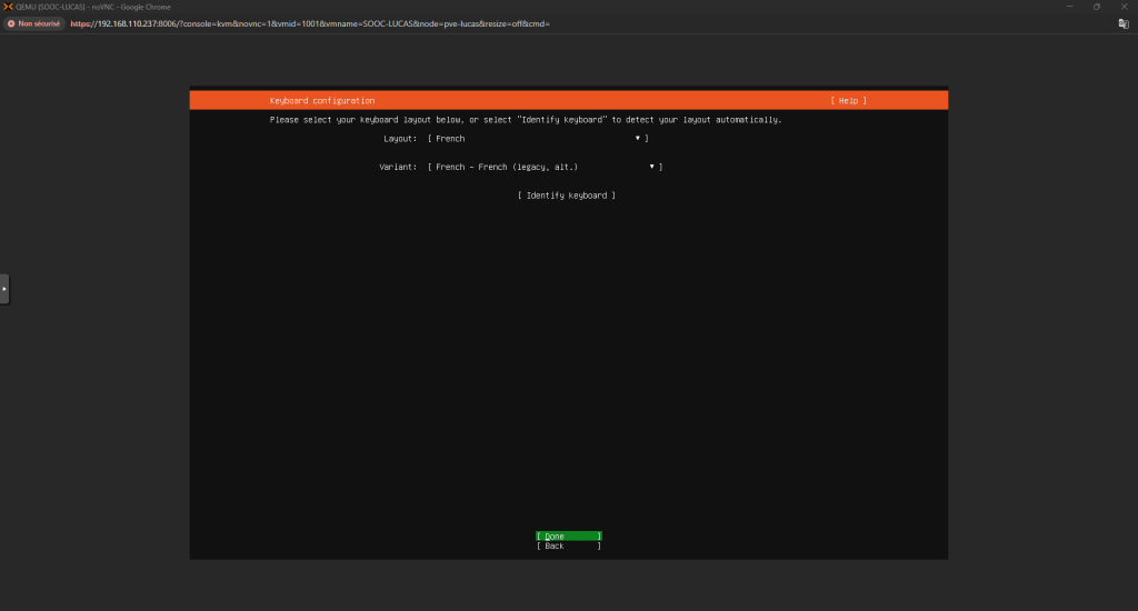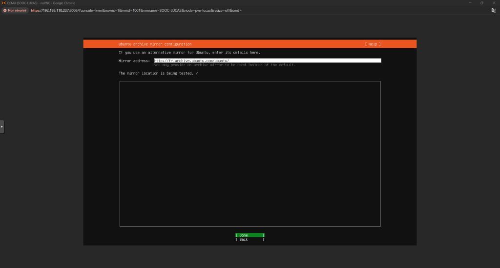 Installation d'Ubuntu 24.04 Voici comment installer un serveur Ubuntu 24.04 : Tout d’abord, quand on lance le setup ça nous demandera le layout à choisir pour notre clavier Configurer l’interface réseau selon les besoins Puis vérifier l’adresse du miroir Ubuntu : Continuer la configuration des disques : Ensuite, choisissez votre Nom d’utilisateur, le Nom du Serveur et votre Mot de Passe Et après, installez le serveur OpenSSH et installez les packets que vous voulez : La configuration se fera après, il faudra juste redémarrer la machine une fois finis Et c’est finis, la machine est prête ! ... Retour en arrière