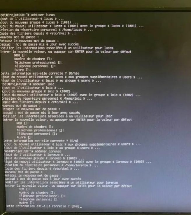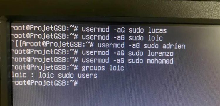 Une fois tout à jour, nous avons créé des comptes users avec des privilèges admin attribués via le groupe sudo pour toutes les membres du projet :