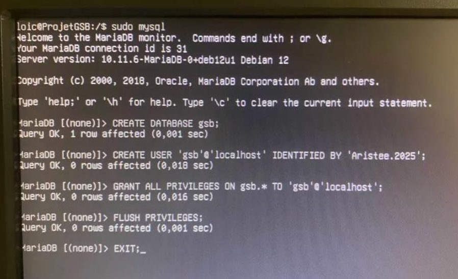 CREATE DATABASE gsb; CREATE USER 'gsb'@'localhost' IDENTIFIED BY 'mot_de_passe'; GRANT ALL PRIVILEGES ON gsb.* TO 'gsb'@'localhost'; FLUSH PRIVILEGES;
