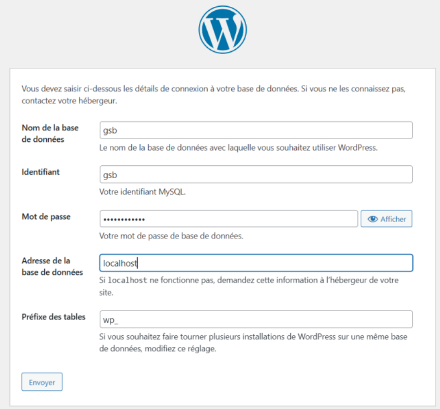 Il ne restait alors plus qu’à se rendre sur notre site et de configurer la base de données dans WordPress :